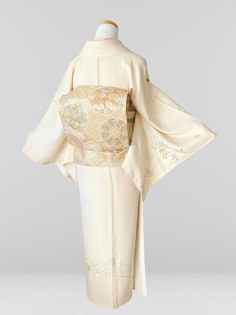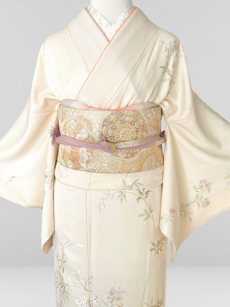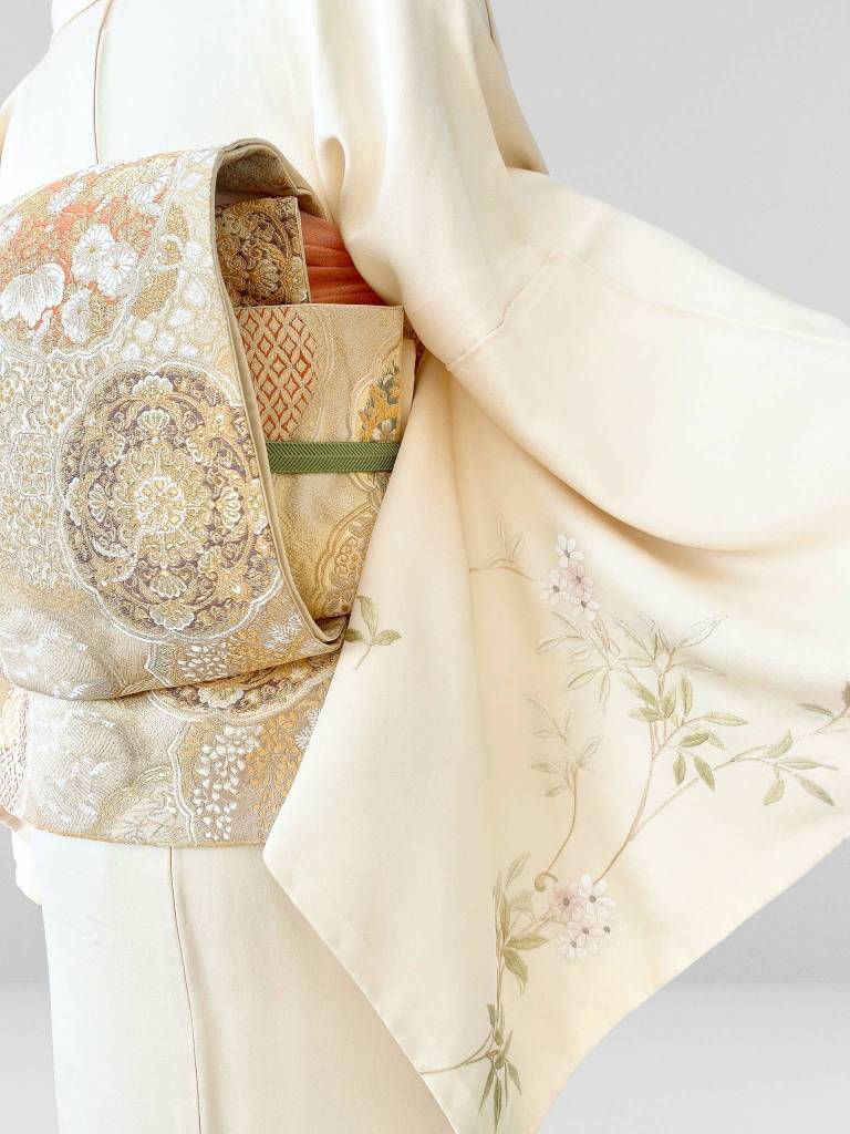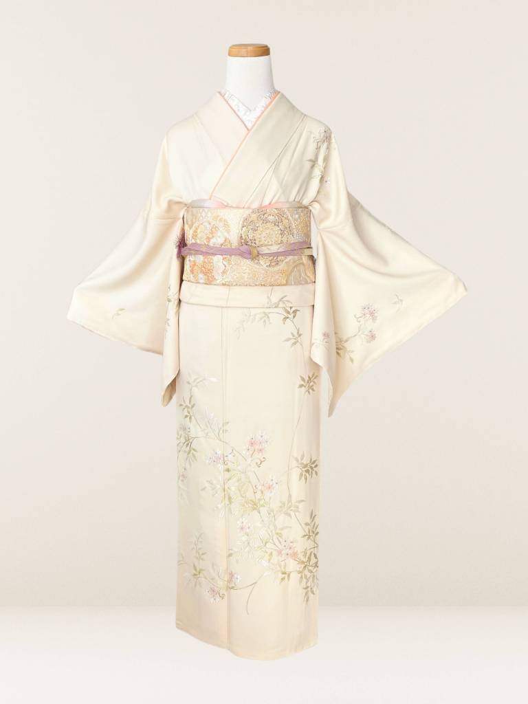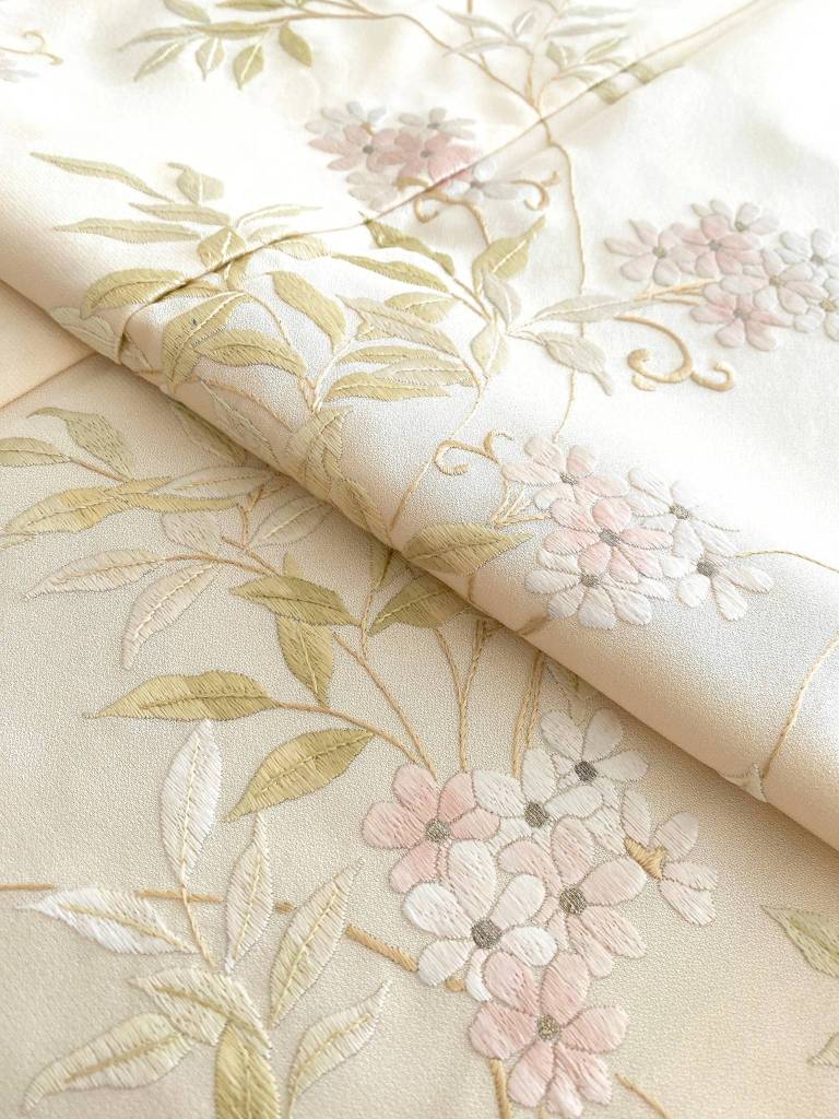 お色はたおやかな砂色(アイボリーに近いイエローベージュ)を基調にして、愛らしい桃色とグリーンの糸で花唐草紋様を手刺繍で絵羽付しています