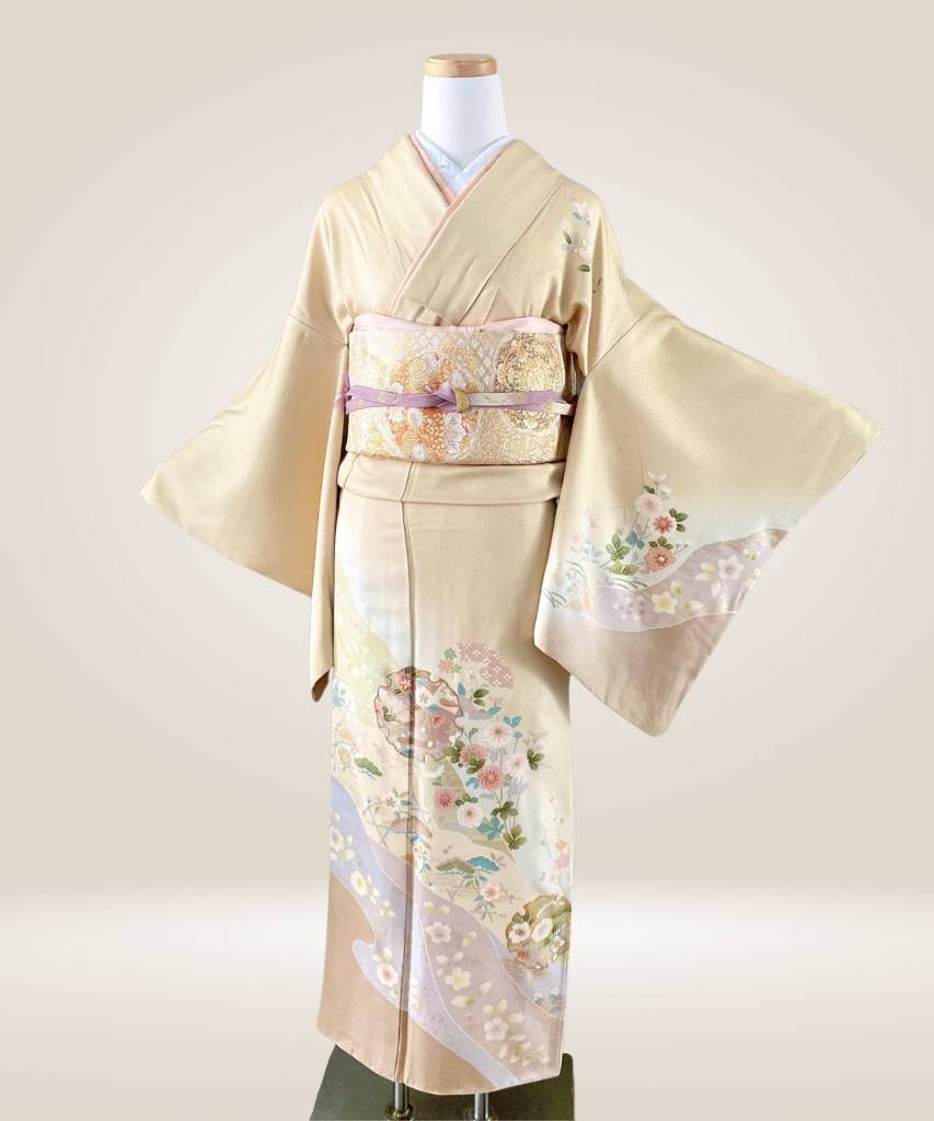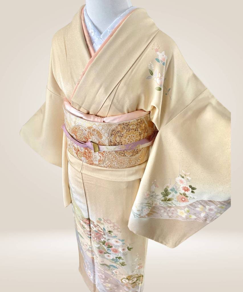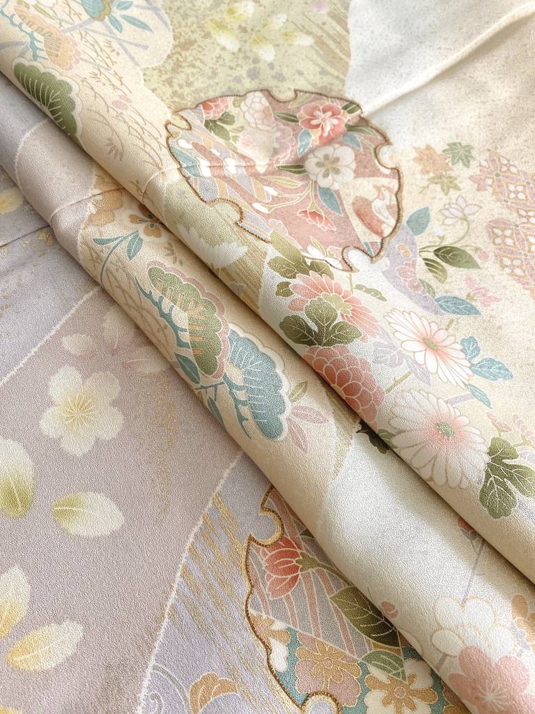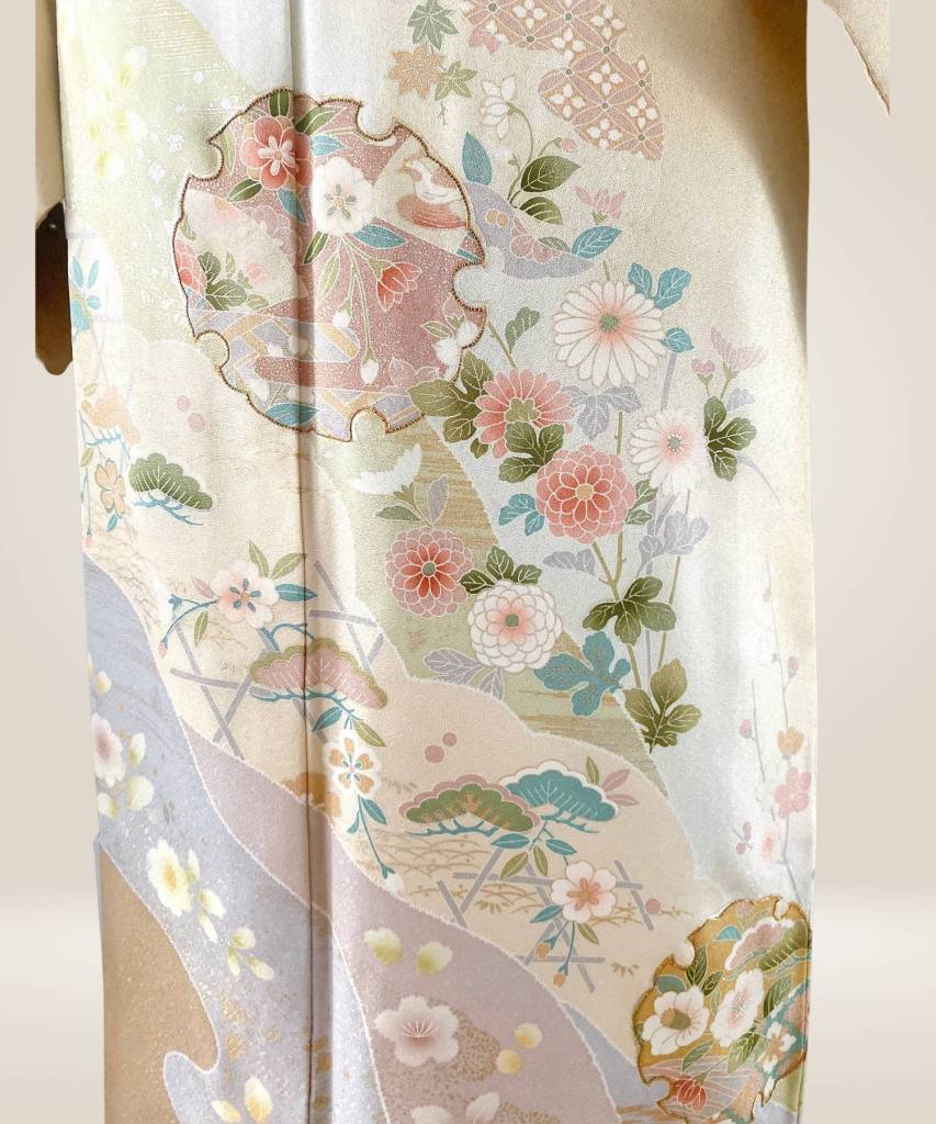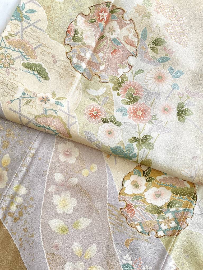 穏やかなクリームベージュのに乗った華やかな色彩のは松や花模様。
