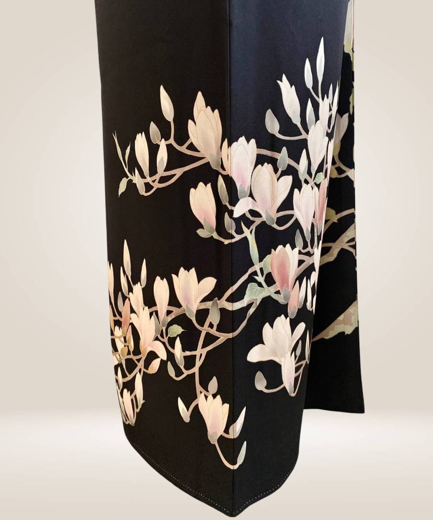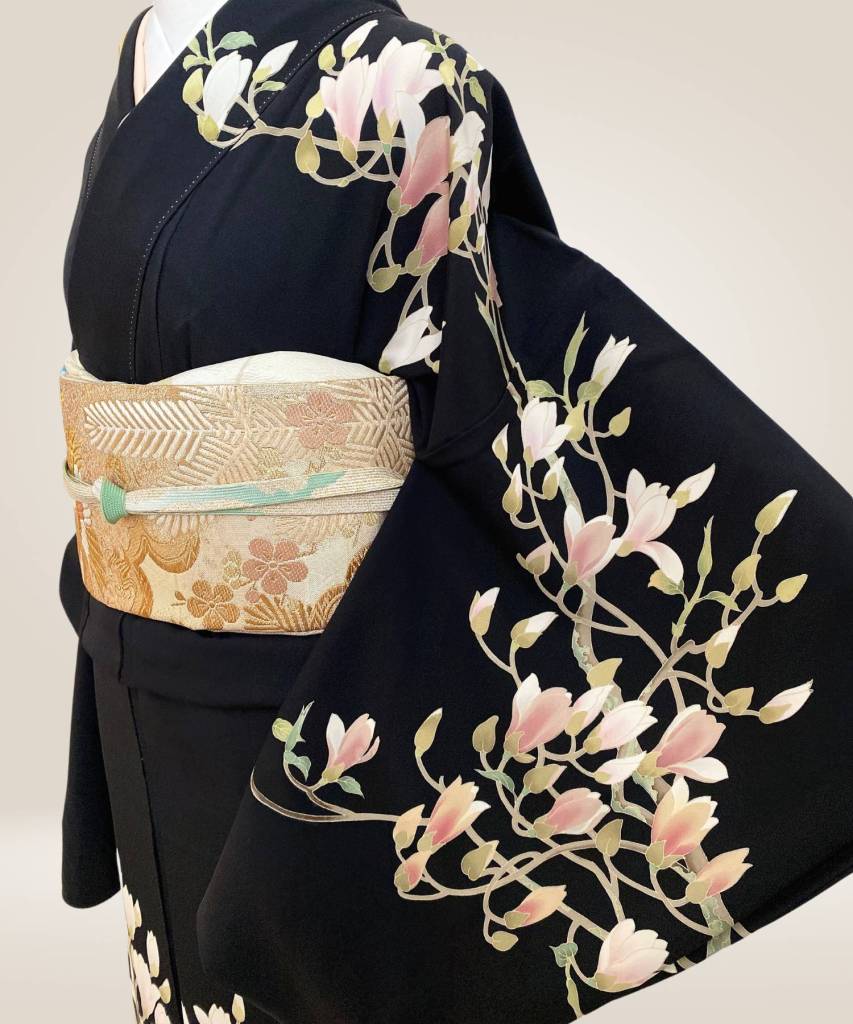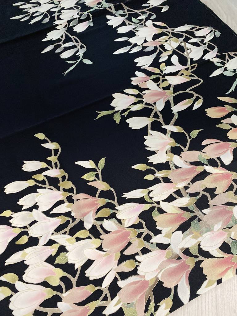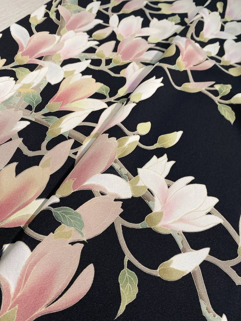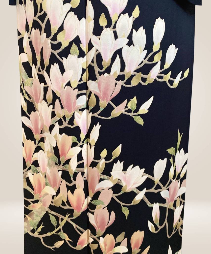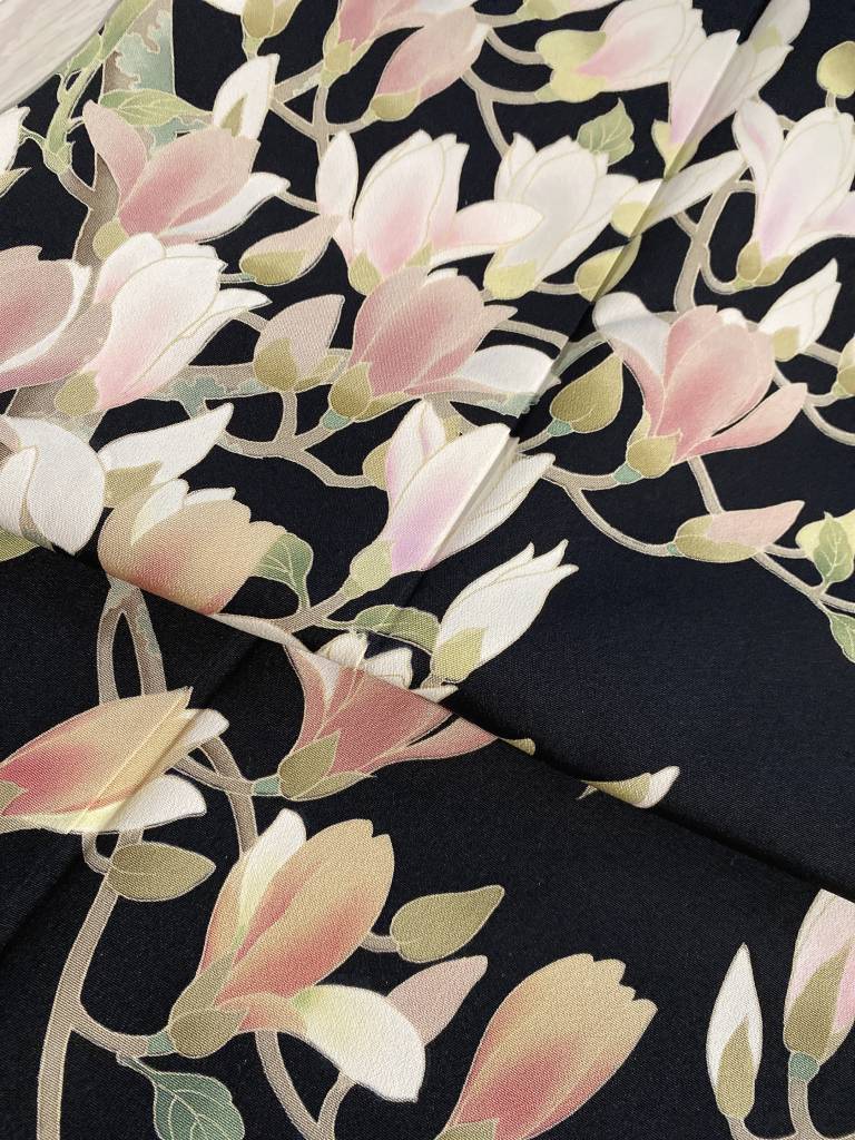 白から桃色の色合いが瑞々しい木蓮模様の訪問着。