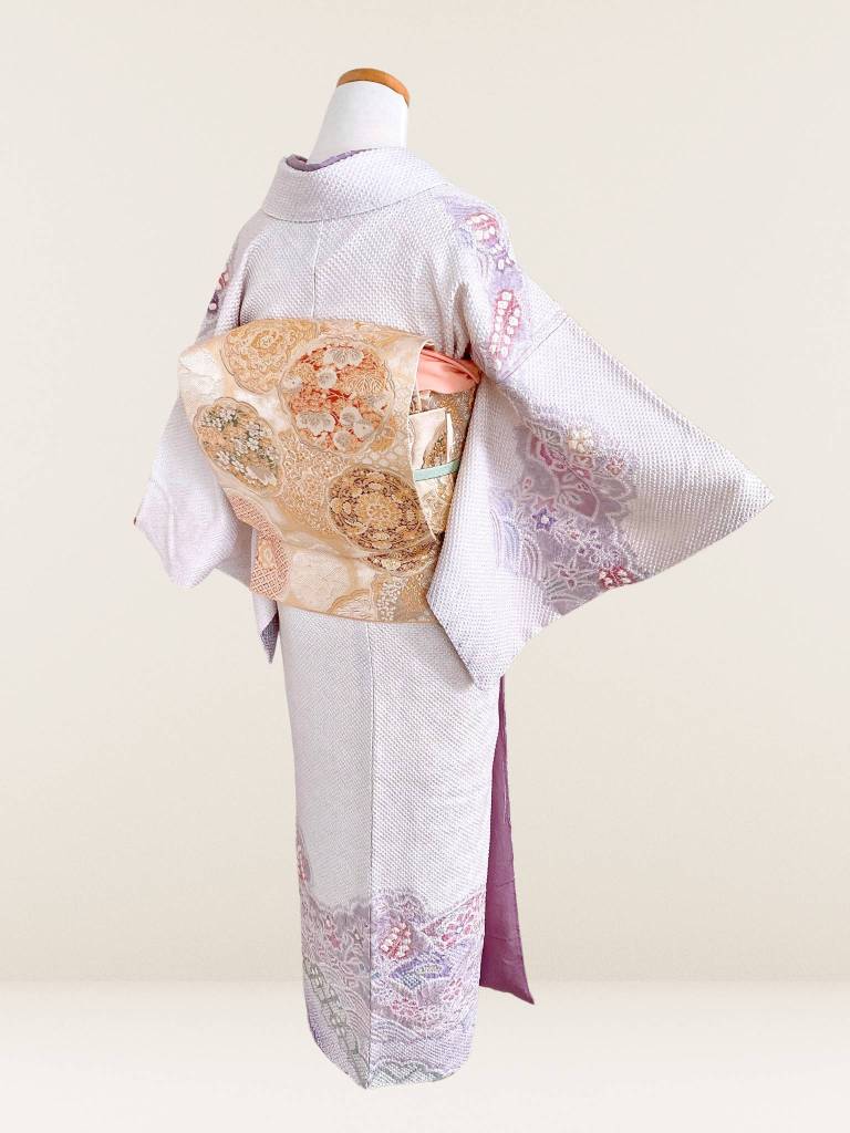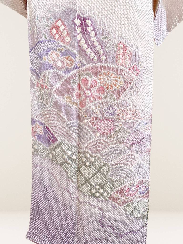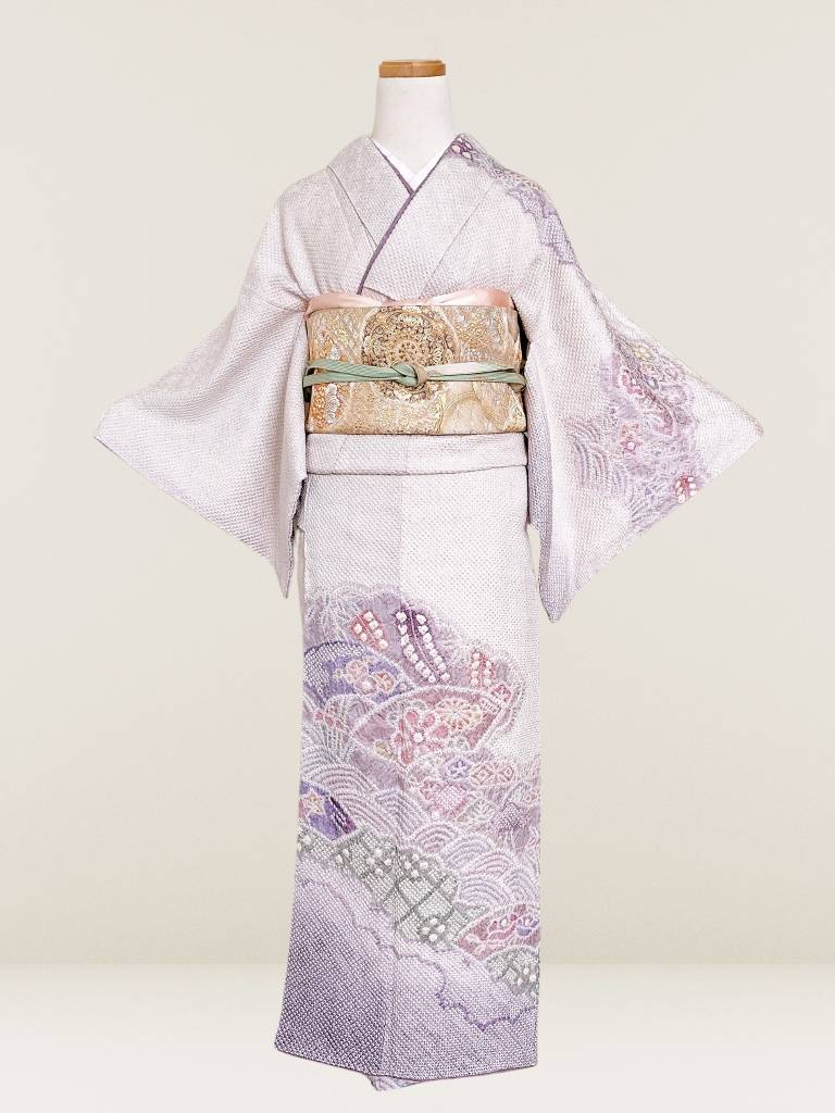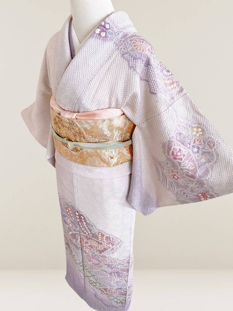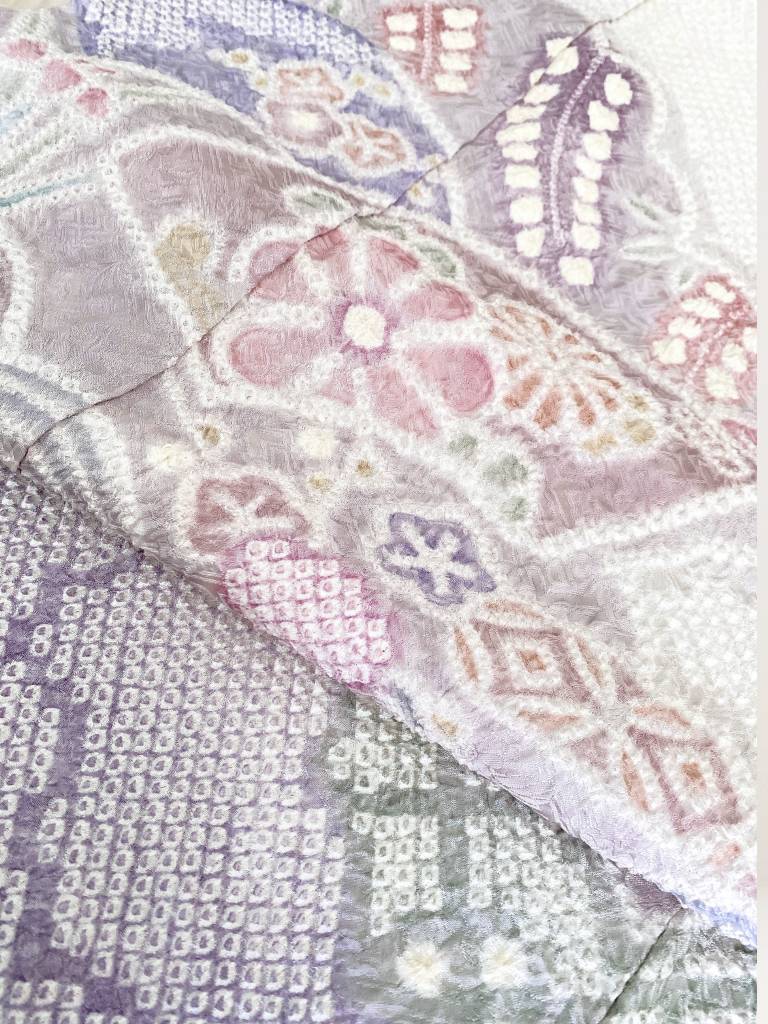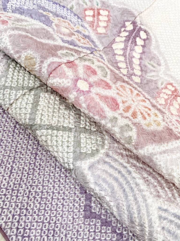 淡いパープルに染め上げられた生地に施された疋田絞り。ふんわりと華やかにに薫る着姿が叶う総絞りの訪問着です。