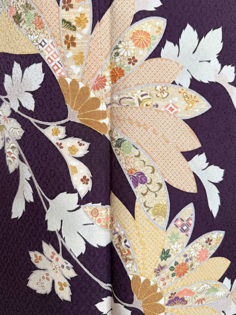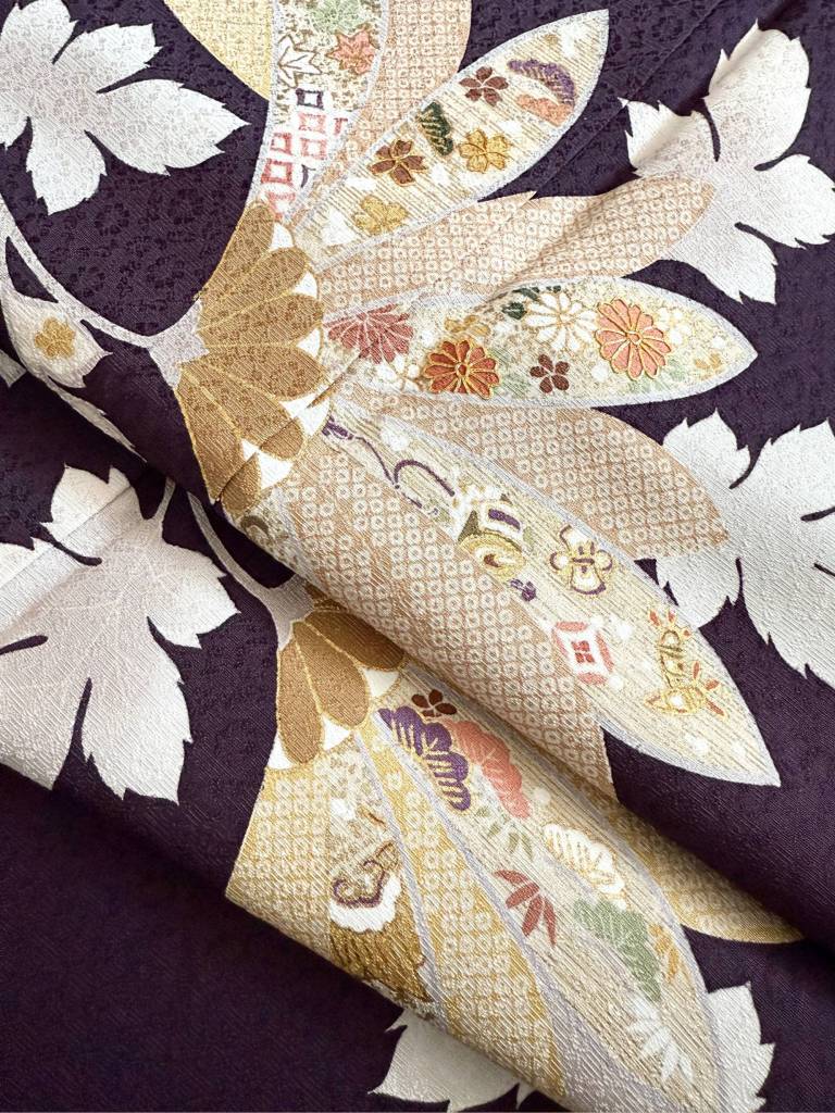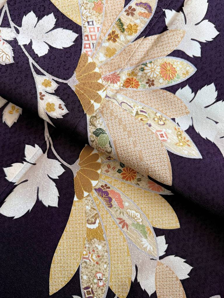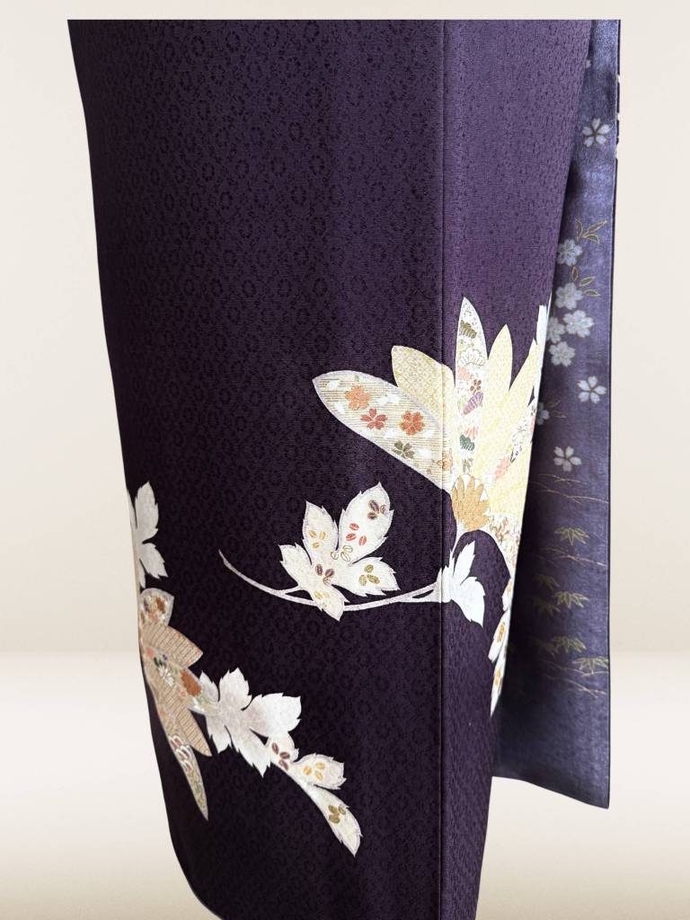 深みのある紫紺(しこん)色に染め上げられた滑らかな正絹地。凛々しく描かれた菊に宝尽の意匠をあしらえた粋でエレガントな訪問着です。赤の輪出し帯揚げと取り合わせ、こなれ感も演出しております