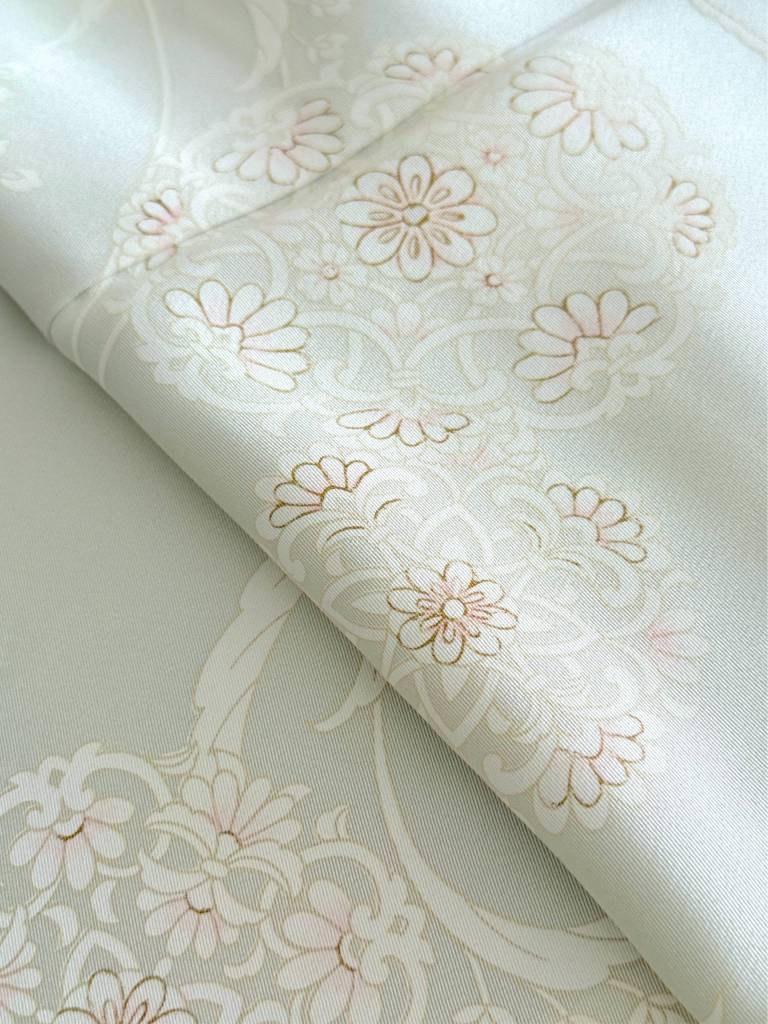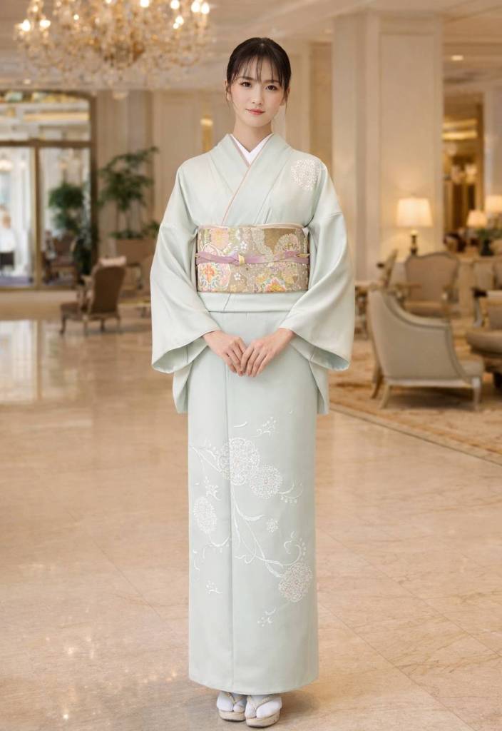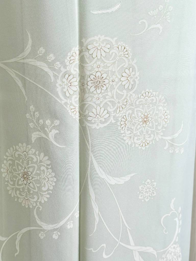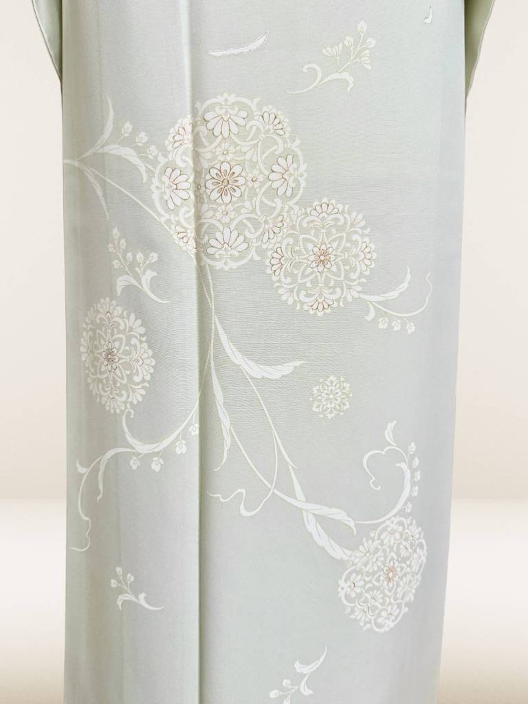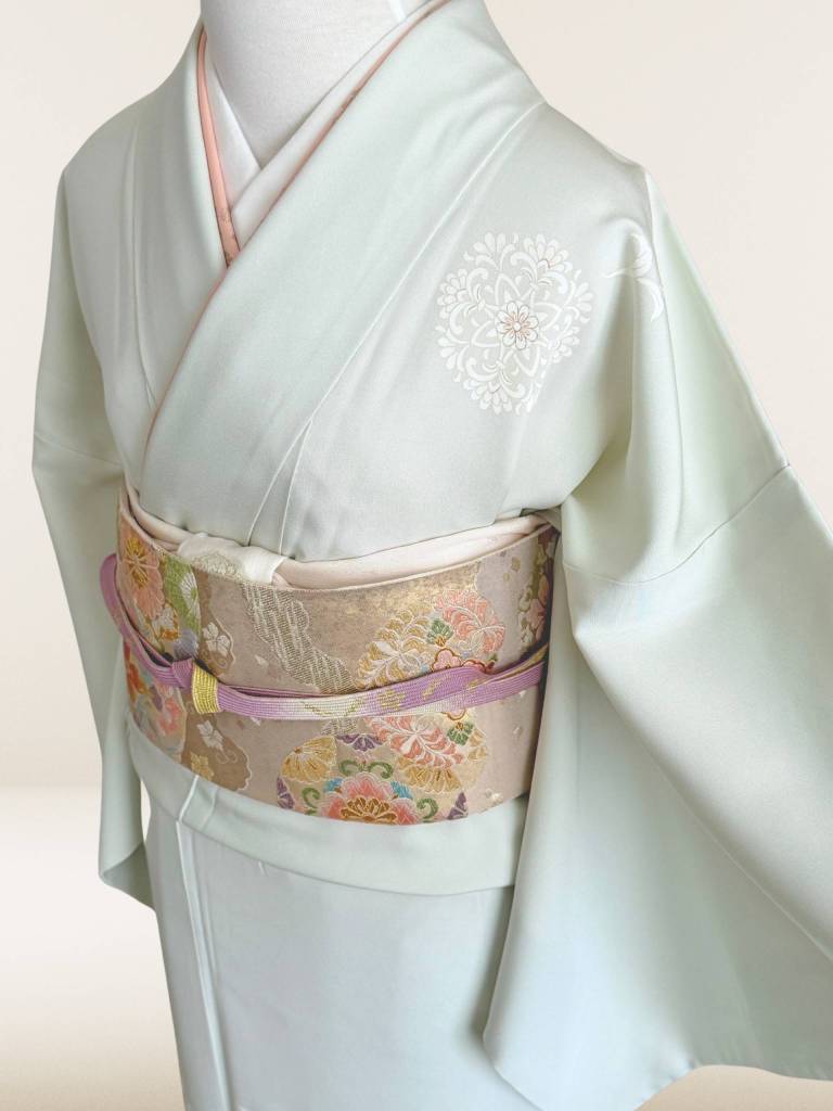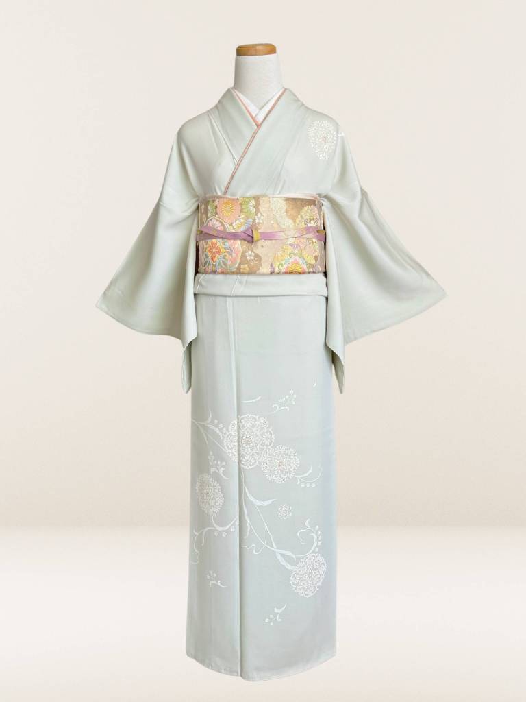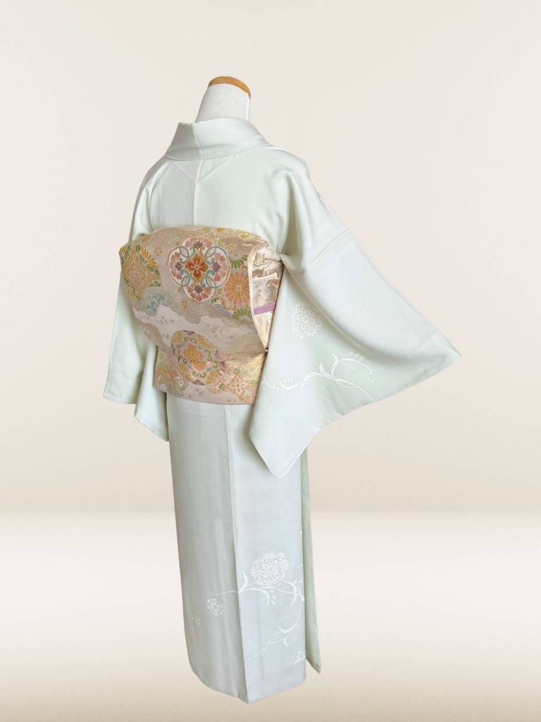 麗しいオーラが溢れるペールカラーの訪問着。主張しすぎることなく、しっとりと落ち着いた大人の女性らしい佇まいをお楽しみ頂けます。