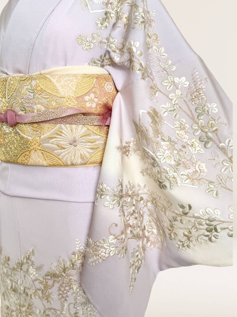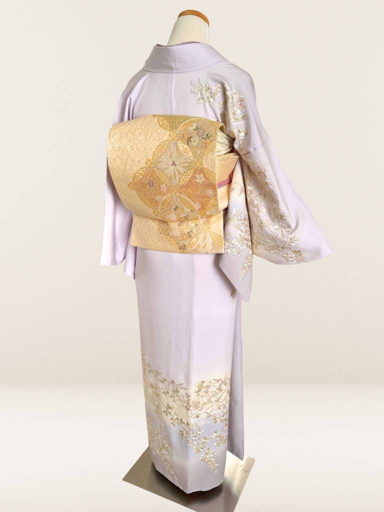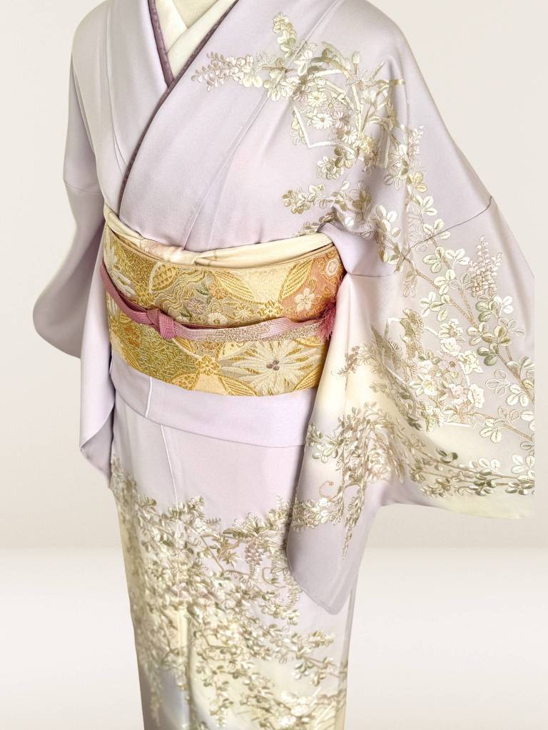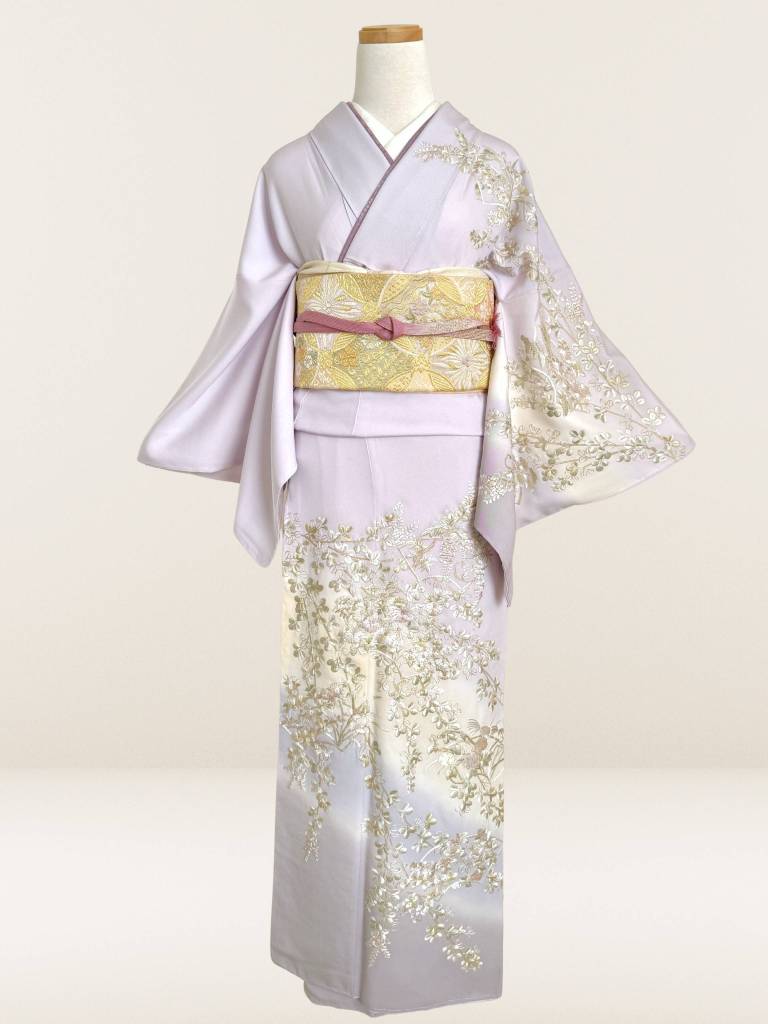 肌触りのいいしなやかな絹地は、最高級丹後縮緬地。ごく淡い藤色を基調に染めあげて、松竹梅や四季の花々の意匠を高雅に表現致しました。