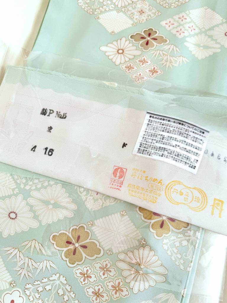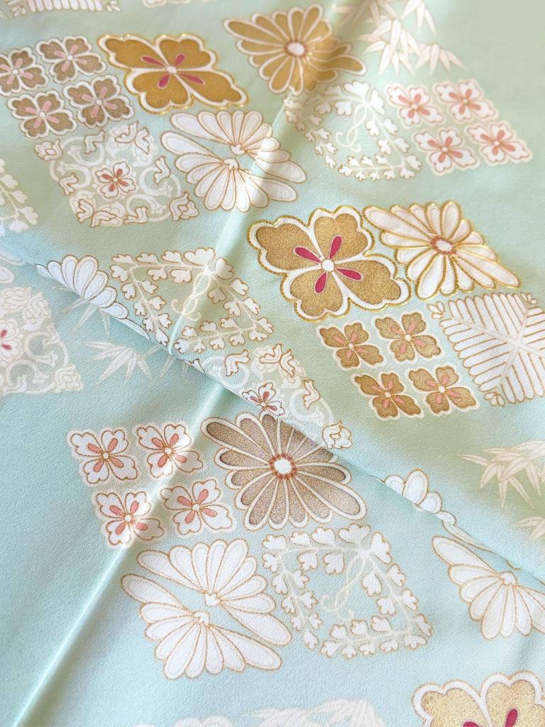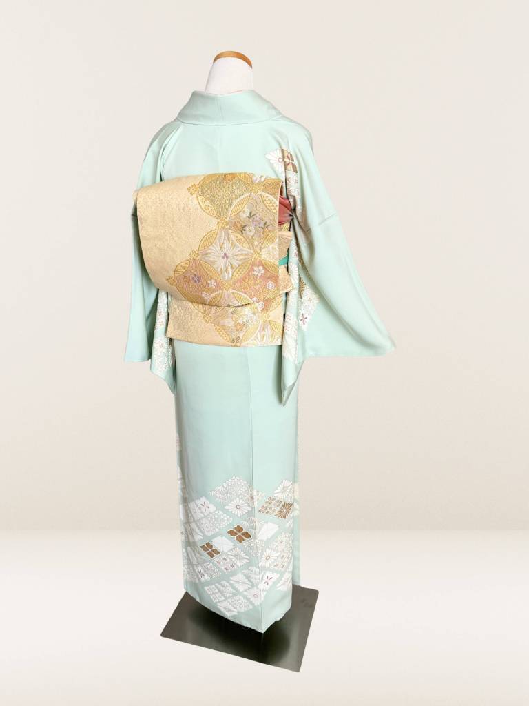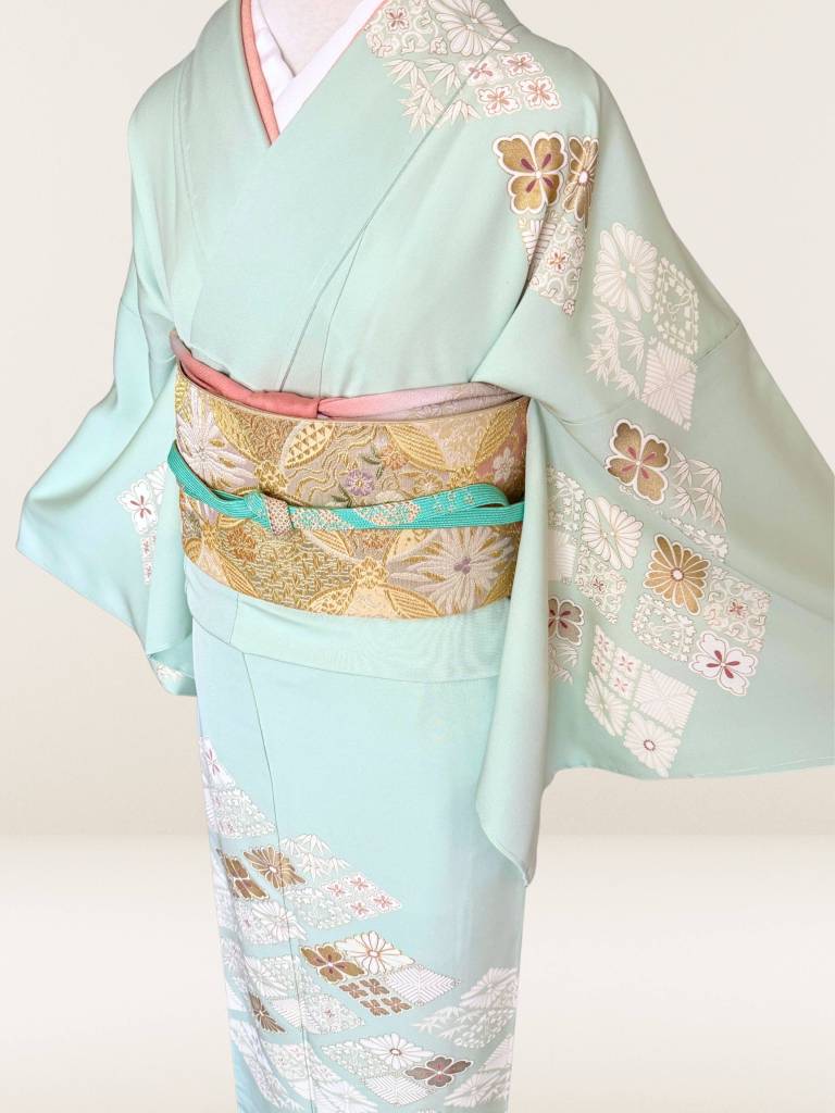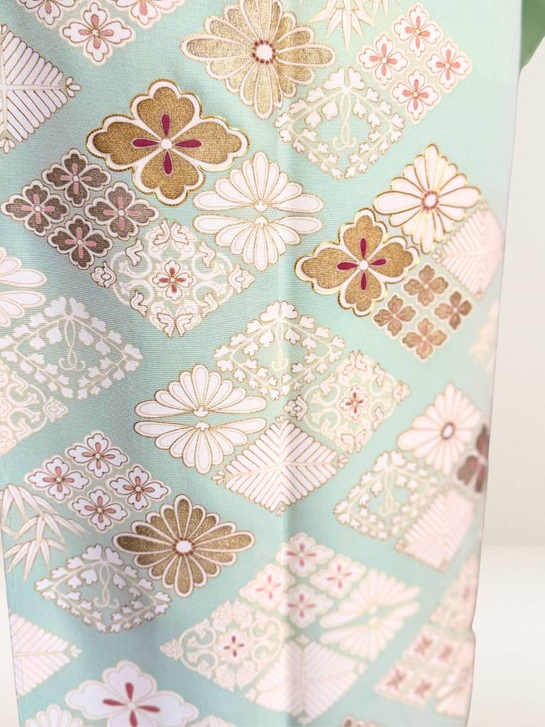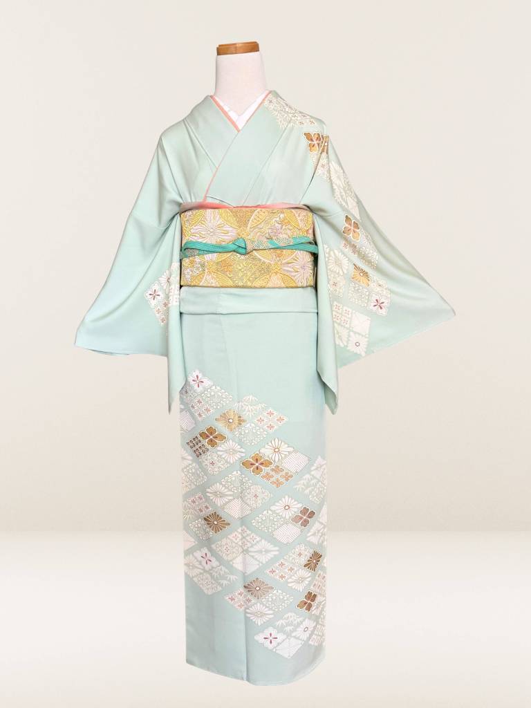 その地を透明感ある淡い白緑色に染めなして、お柄には菊や松葉、笹などの花菱模様を描き出しました。