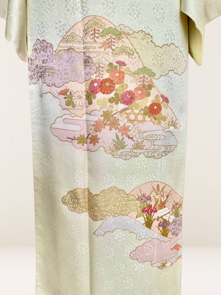 一目で藤井寛の着物とわかる瑞雲や四季の花の意匠がふんだんに描かれ、伝統美と気品を兼ね備えた逸品です。