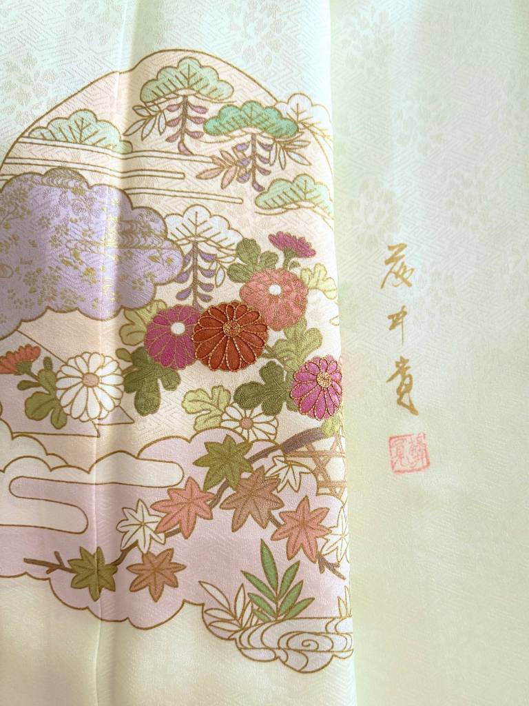 京友禅界において、独自の本格友禅を貫く藤井寛。独⾃の美しい世界観を持つ「藤井寛のきもの」は美智子上皇后陛下、皇后陛下、紀⼦様、眞⼦様など多くの皇室の⽅にお召しいただいていることからロイヤルカラーと呼ばれています。