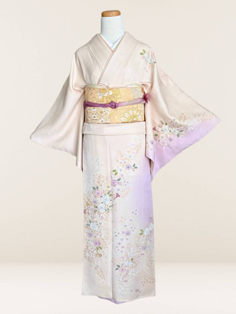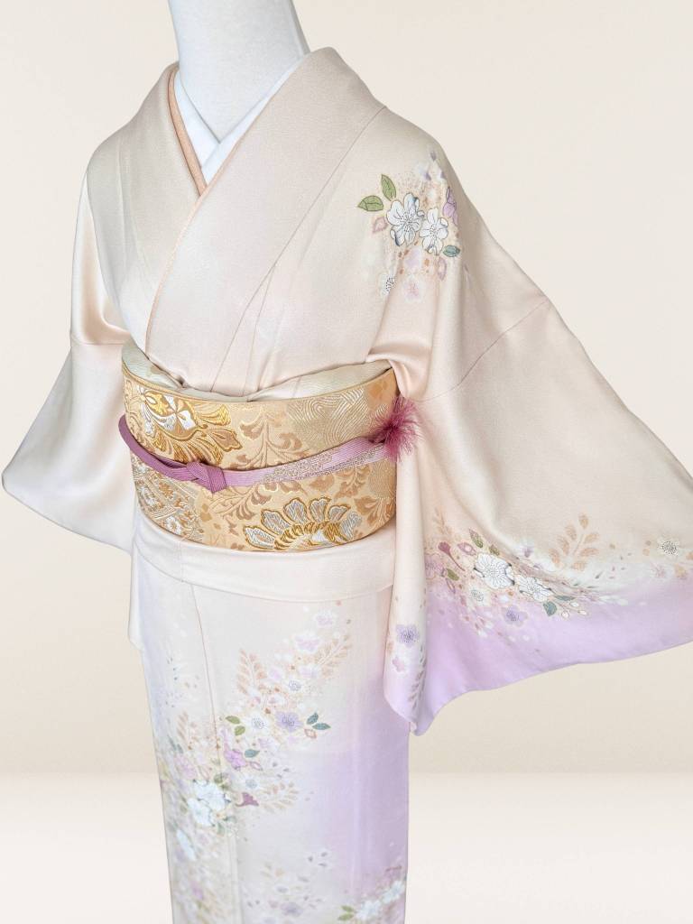ご淡いアイボリーベージュに藤色の暈し染めが麗しい丹後ちりめん地に、ふんわりと施された辻ヶ花絞りが宝石の様に煌めく夢心地な一枚。