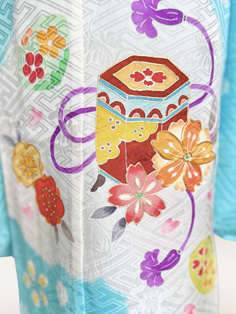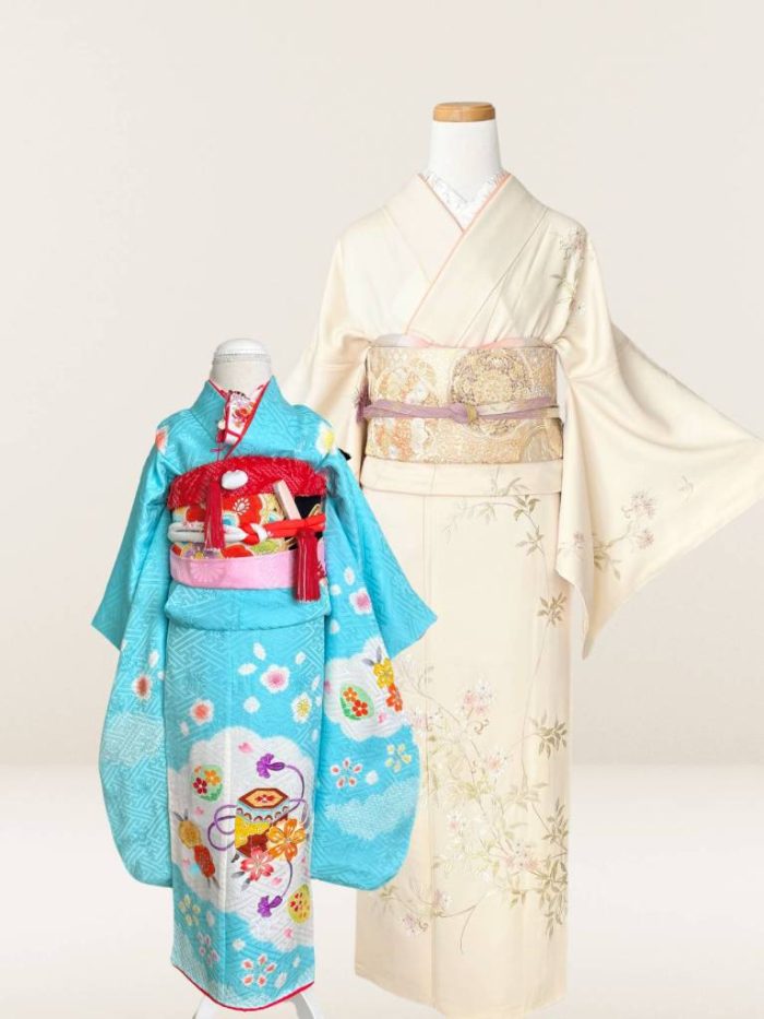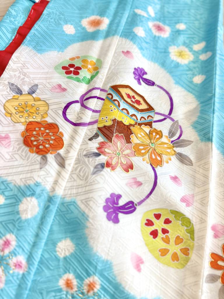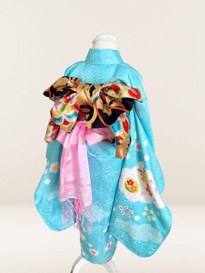 三越誂えの四つ身7歳祝い着です。しおらしい貝桶模様と絞りの花模様が水色の地色に描かれたお着物。赤系の小物と取り合わせ、古典的で正統派な七五三スタイルを提案いたします