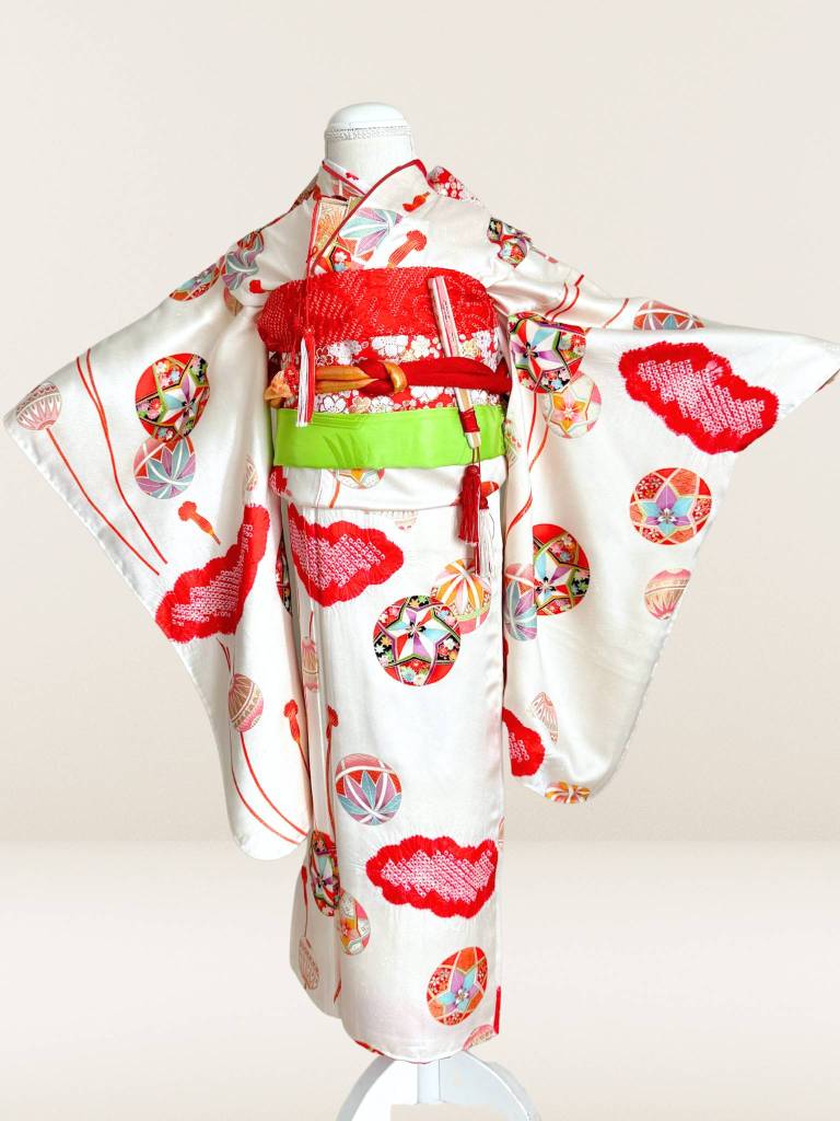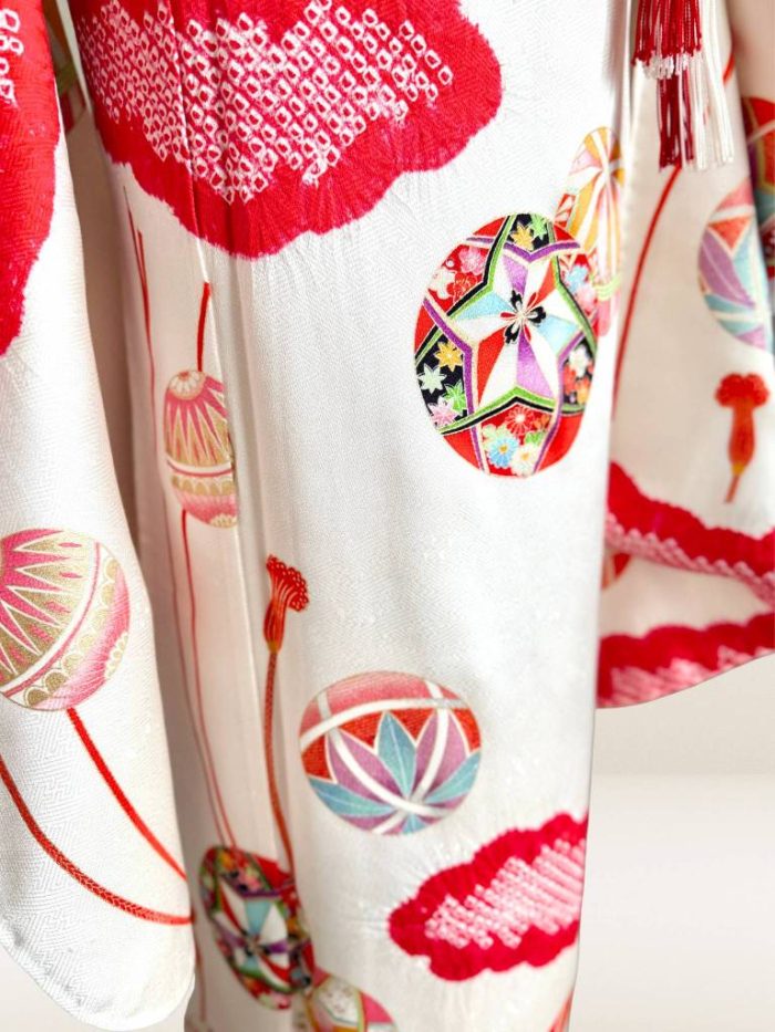 絞り染めで型取られた雲取りと毬模様が愛らしい四つ身着物です