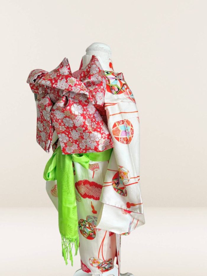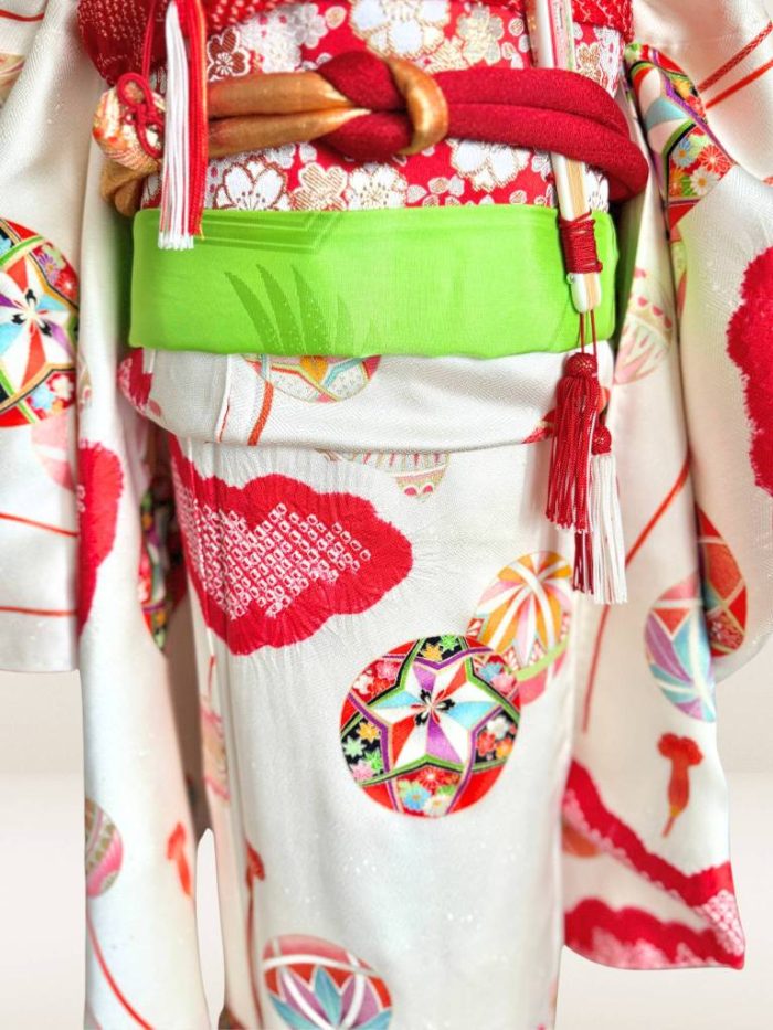 ①新品ストレッチ足袋※1 ②長襦袢※2 ③刺繍半衿(襦袢に縫い付け済み) ④四つ身着物 ⑤作り帯 ⑥帯締め ⑦しごき ⑧帯揚げ ⑨草履バッグ ⑩筥迫セット(箱迫/ビラ簪/扇子)