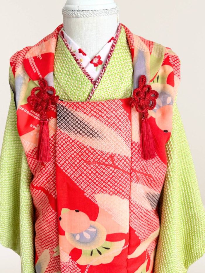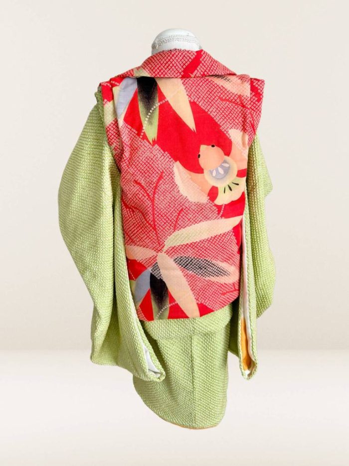 アンテイークの本モス(ウール100%)の長襦袢から作成したふくら雀のお被布に、被布の黄緑の正絹総絞りお着物を合わせました。