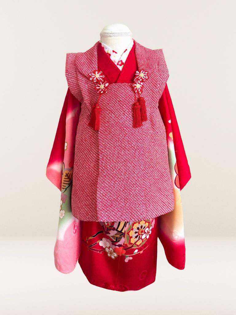 赤い正絹のお着物に赤の総絞りお被布を合わせました