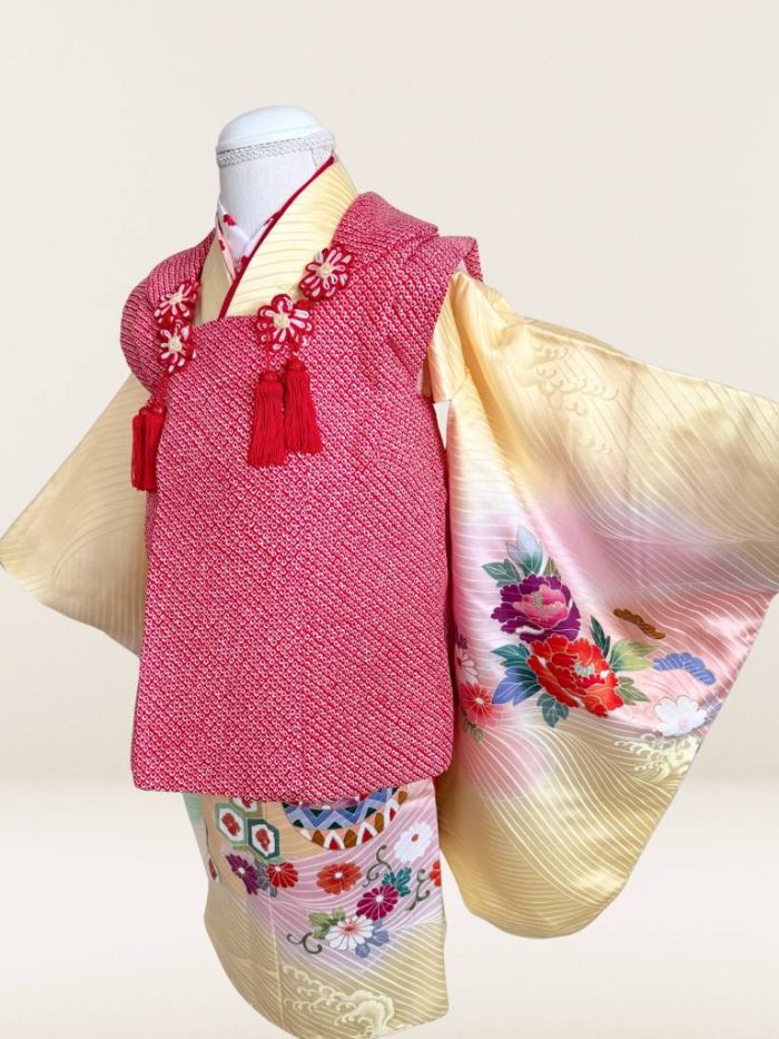正絹が艶めく鞠模様のお淑やかなお着物に総絞りの赤いお被布を合わせました。