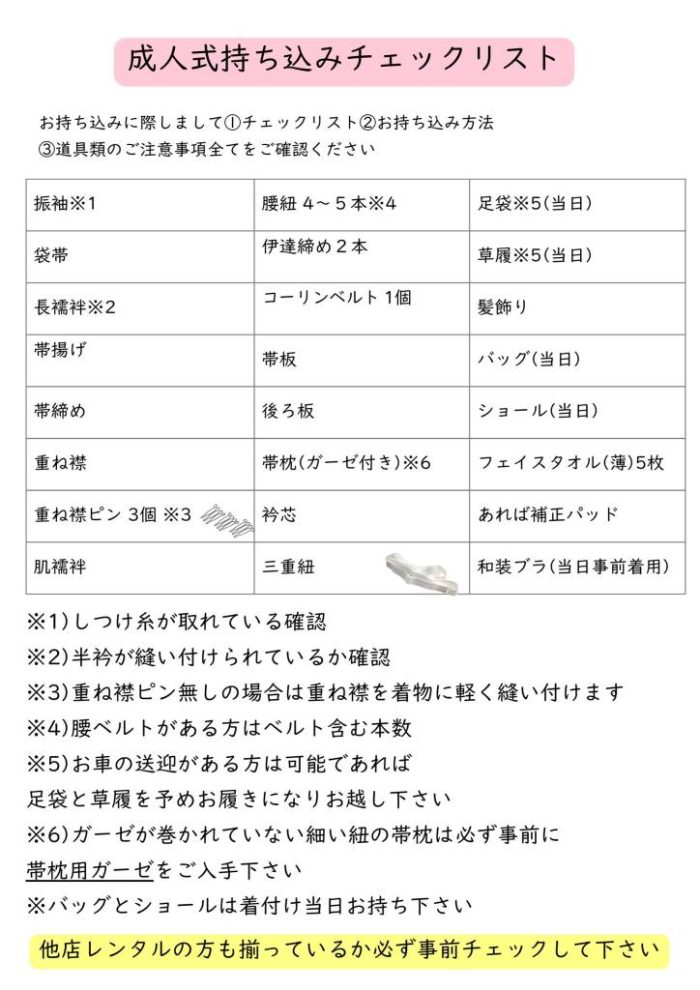 着付け道具や着物類は揃っていると思いますので補正用タオルや和装ブラなどのご確認をお願いいたします