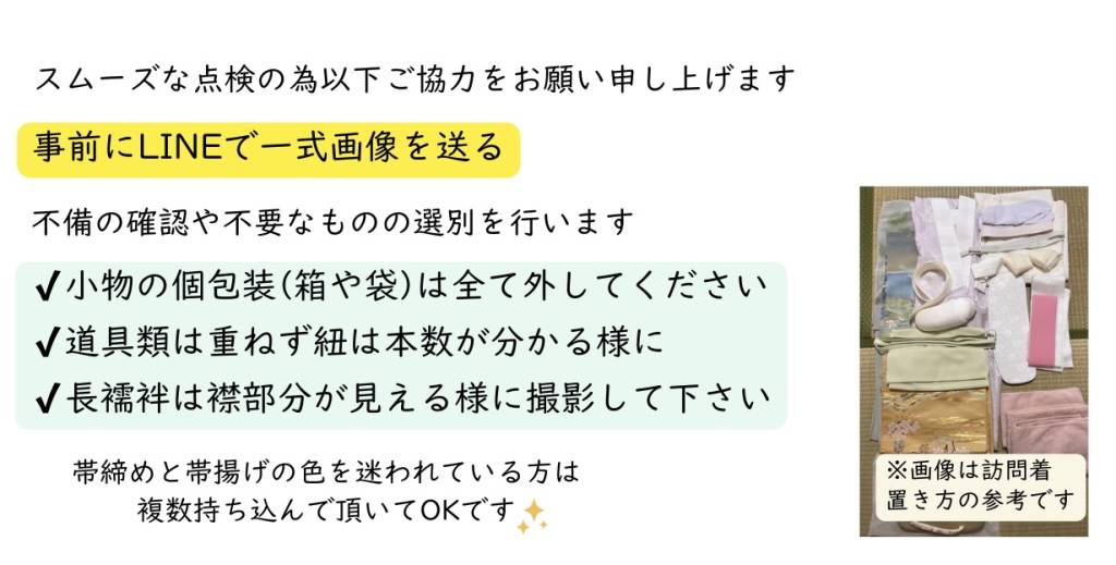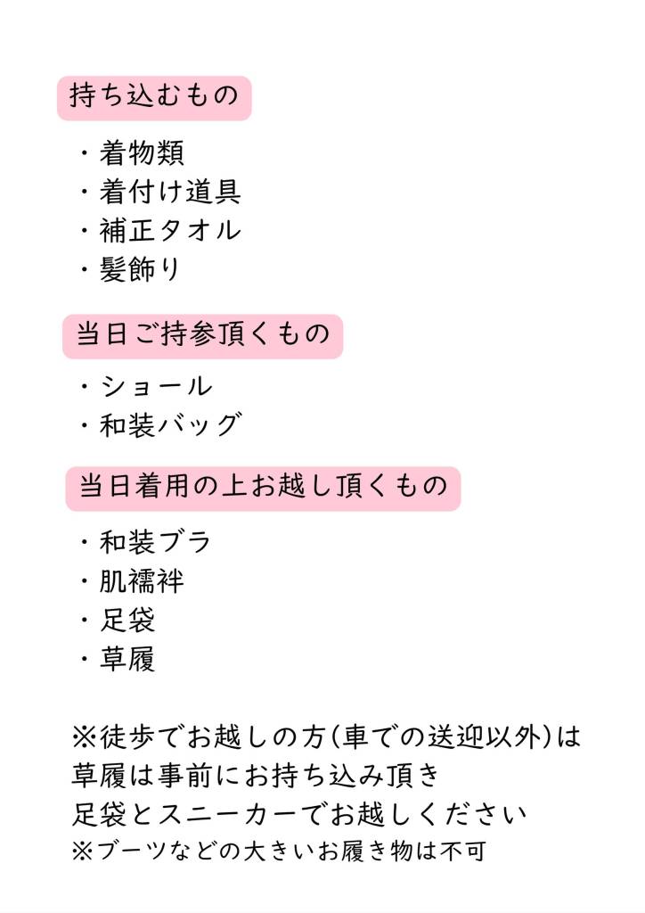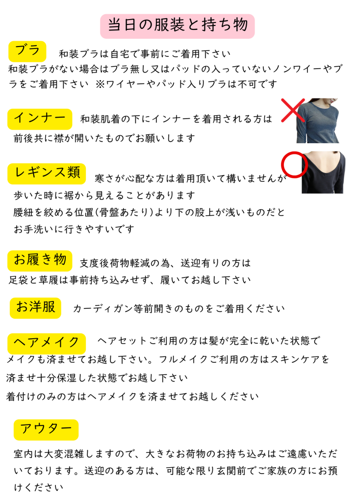 当日はスムーズにお支度が進むよう、万全を期してお迎えいたします。何卒ご協力いただきます様お願い申し上げます
