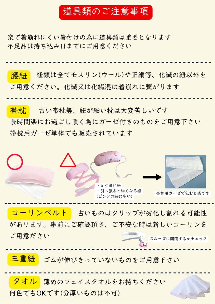 使用する着付け道具の状態によっては、着付けが苦しかったり、崩れに繋がる可能性も出て参りますので下記を参考にご準備ください