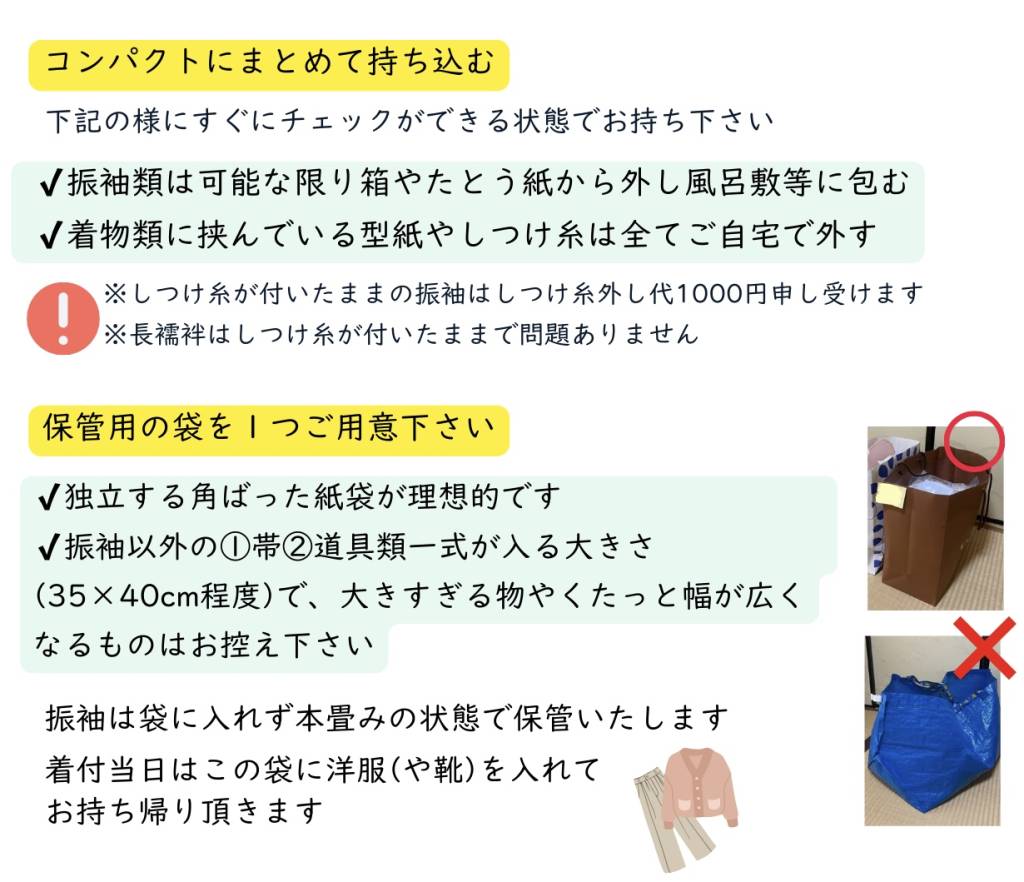 他店レンタルの方もご自前の着物の方同様お持ち込みください。レンタル店の段ボールや衣装ケースでの持込はご遠慮ください