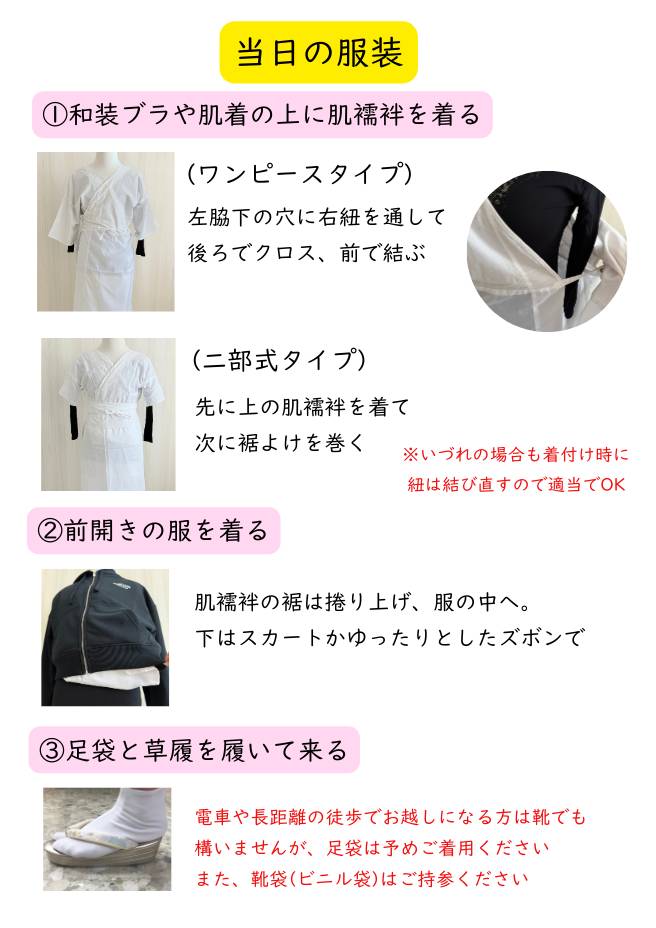 当日の服装は前開きの洋服で、和装ブラやノンワイヤーブラや下着は事前にご自宅で着用して下さい。